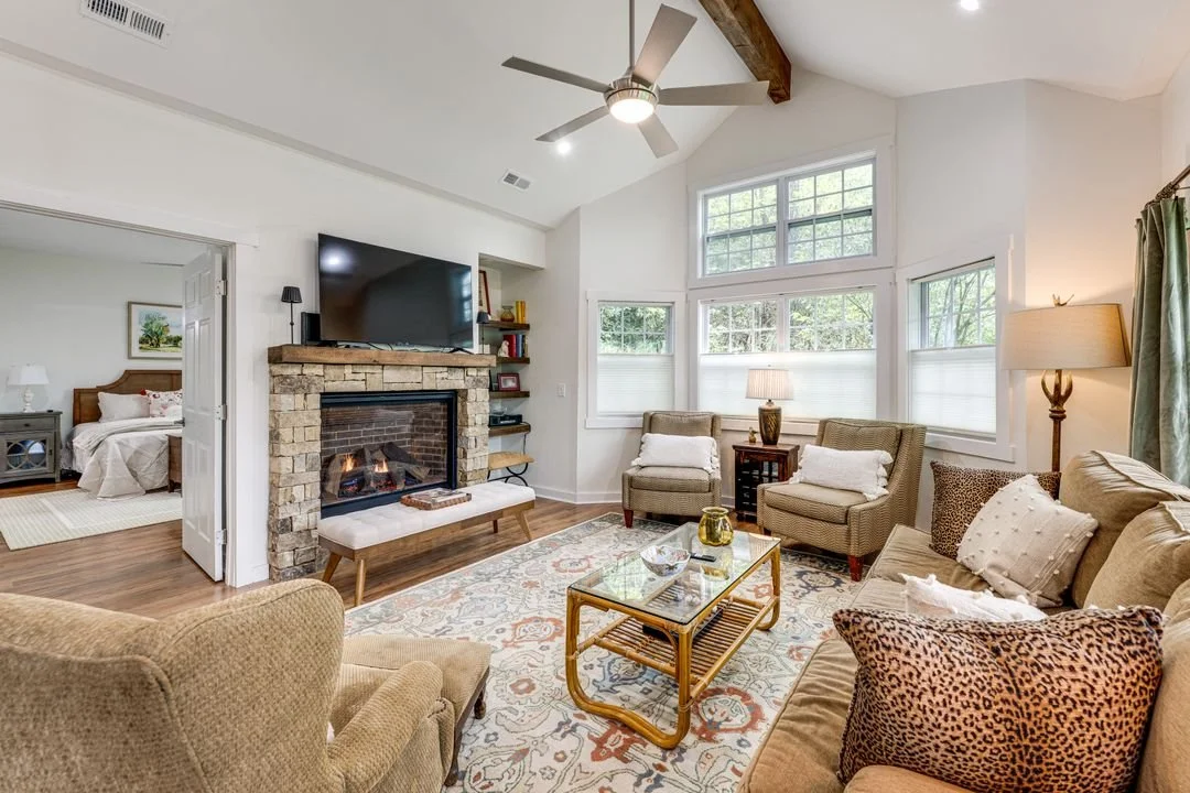 Where ‘rustic escape’ meets ‘modern pleasures,’ this 2-bedroom, 2-bath townhome delivers it all on your Blue Ridge Mountain getaway. Situated in The Woods Resort, this bright, chic vacation rental offers access to pools, a beach club, and more. Scenic trails, golf courses, and destinations like Ski Sapphire Valley are just around the corner. After a fun-filled day, return to the cozy quarters for a movie night by the fireplace and a barbecue on the private deck surrounded by wooded views.